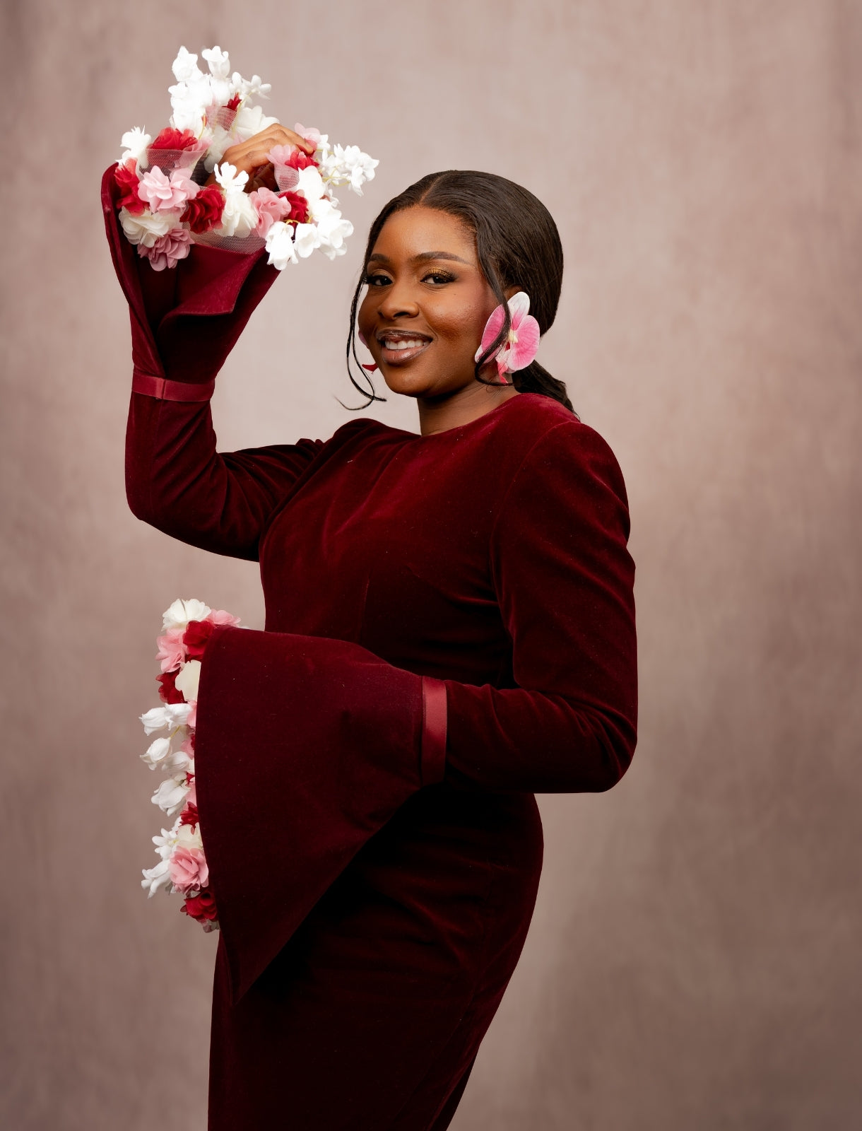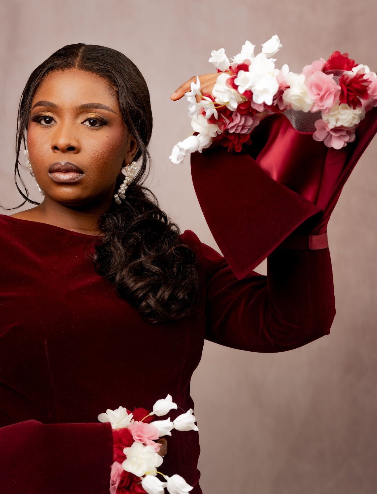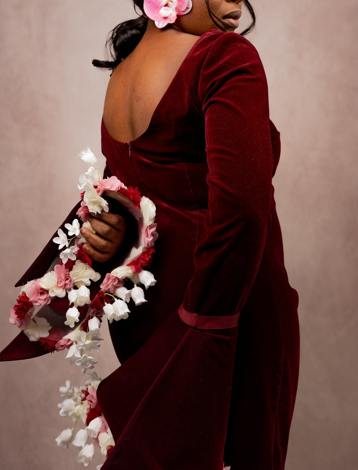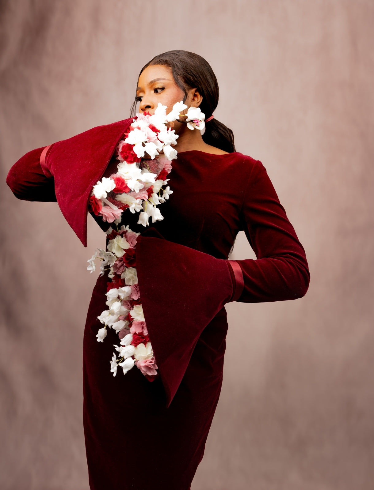 An elegant full-length dress in rich burgundy with a sleek, fitted silhouette. Designed with flared sleeves and a bold floral appliqué running through the front, this piece makes a statement while remaining effortless to wear.