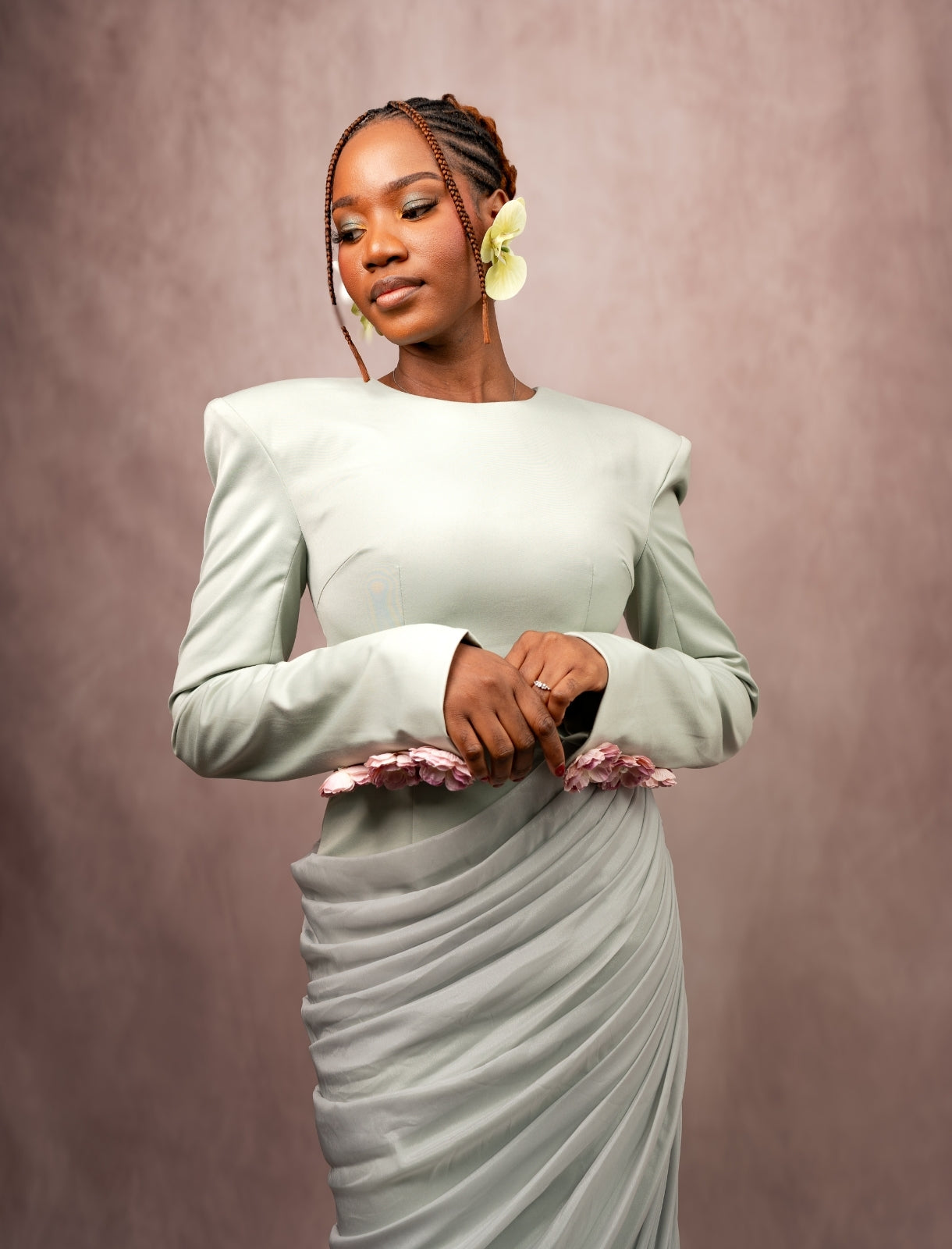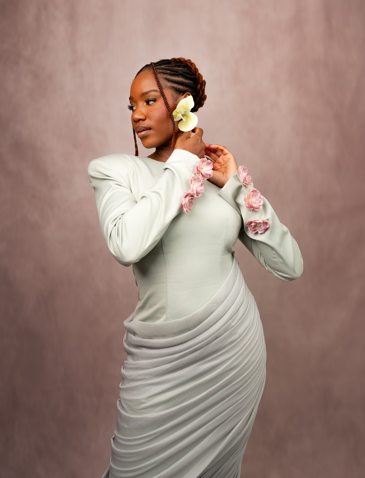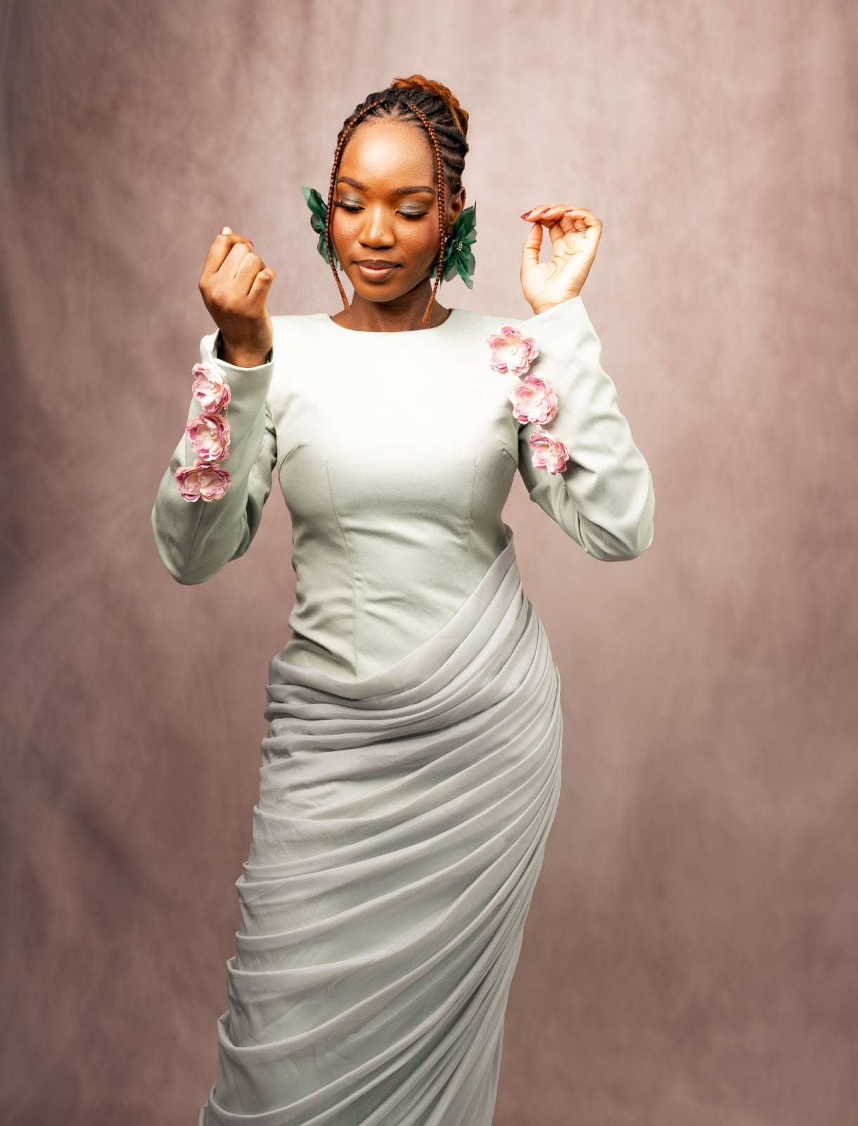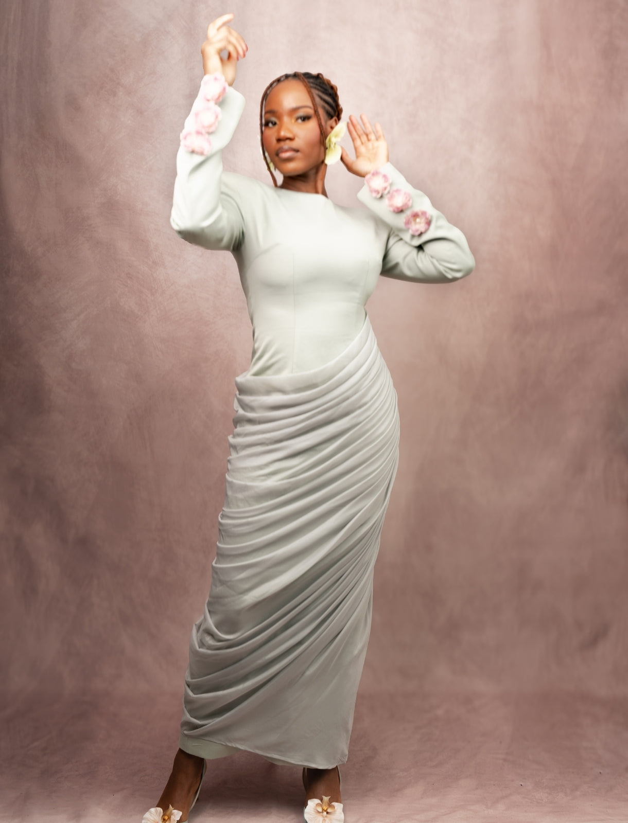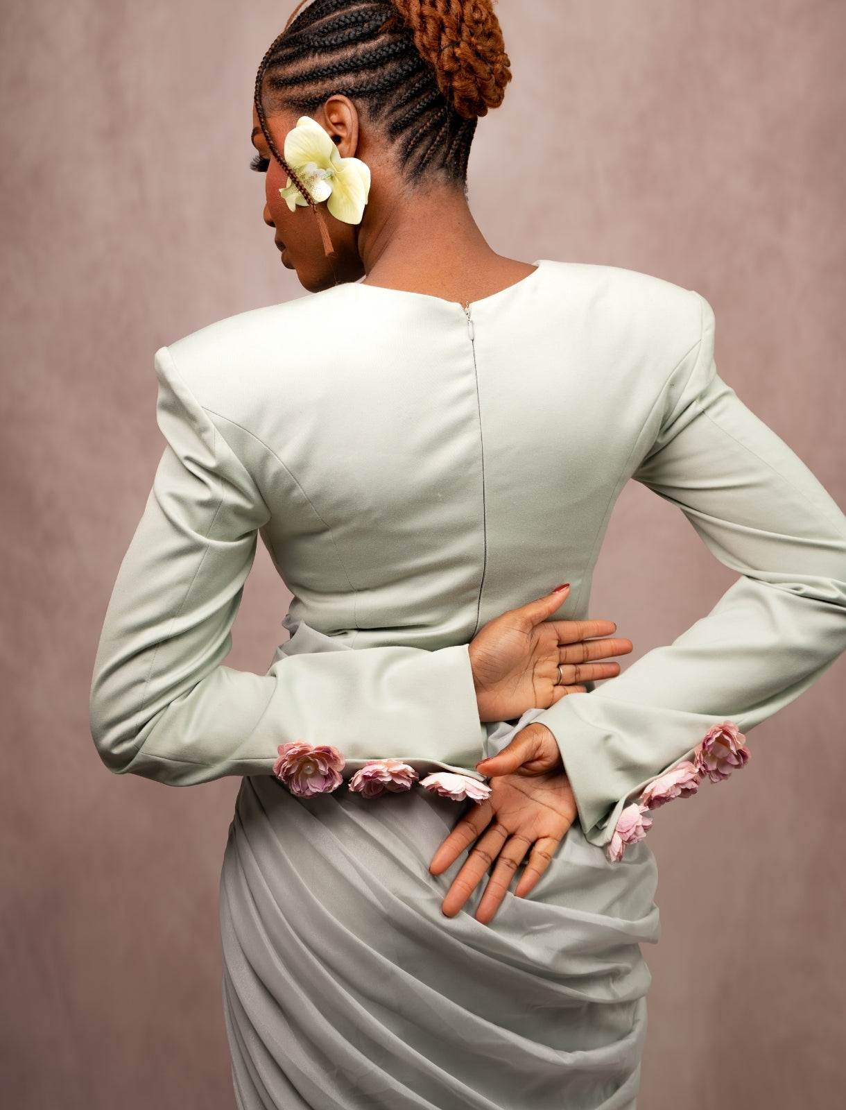 Subtle floral detailing at the cuffs adds a romantic touch, making this dress perfect for weddings, special occasions, or evenings where you want to feel effortlessly put together.
