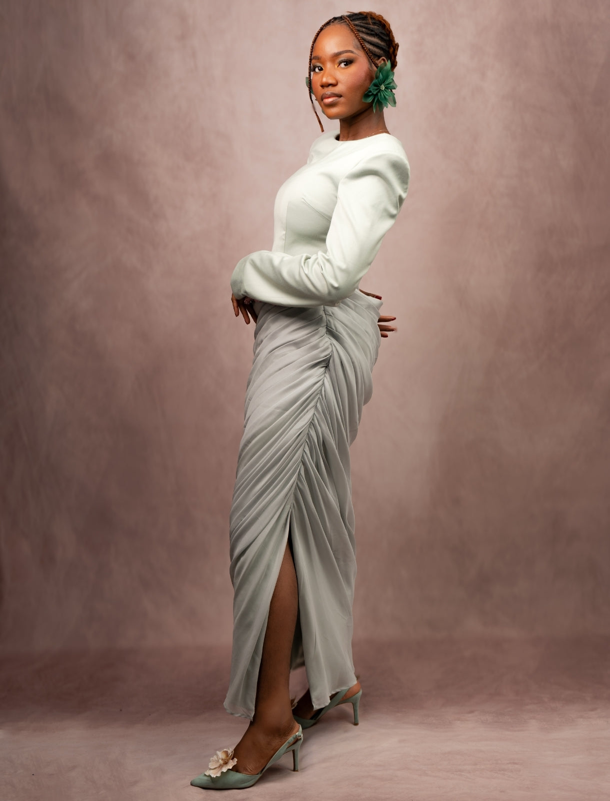 An elegant midi dress designed to flatter. This sage green style features soft ruching through the skirt for a smooth, sculpted fit, paired with a structured bodice for a polished finish.